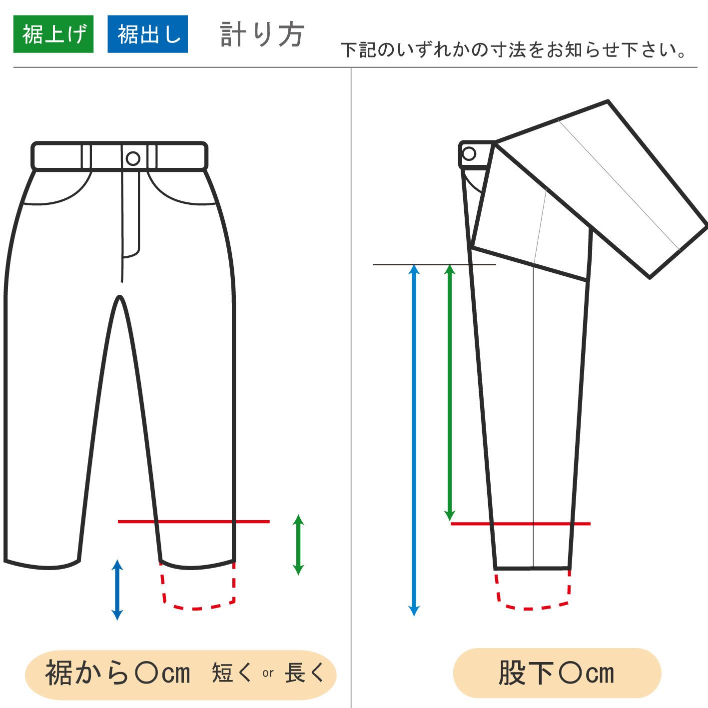 〇半ズボンにする、スリットがある、裾にファスナーが付いている、裾のやぶれ補修後に裾上げ、など特殊なお直しには追加料金が必要なものもございます。ご要望をお問い合わせください。その後金額をご連絡いたします。