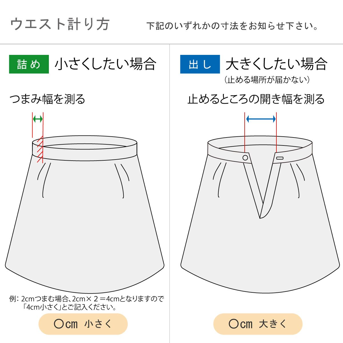 「備考欄」には [ 股下〇cm または 下から〇cm短く、長く ] 「ウエストを◯cm大きく」の様にご記入ください。また、ご要望等もこの欄にご記入ください。